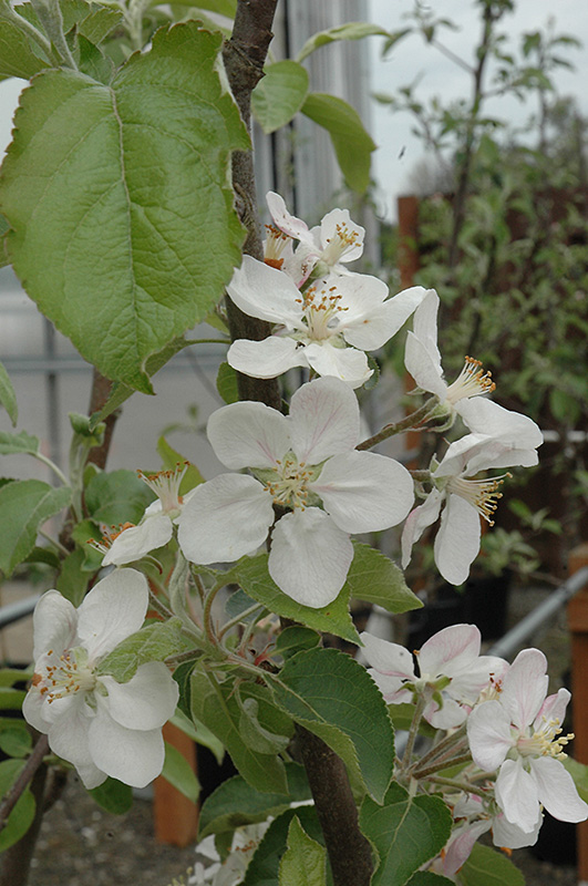 Gala Apple features showy clusters of lightly-scented white flowers with shell pink overtones along the branches in mid spring, which emerge from distinctive pink flower buds. It has forest green deciduous foliage. The pointy leaves turn yellow in fall. The fruits are showy scarlet apples with a yellow blush, which are carried in abundance from late summer to mid fall. The fruit can be messy if allowed to drop on the lawn or walkways, and may require occasional clean-up.