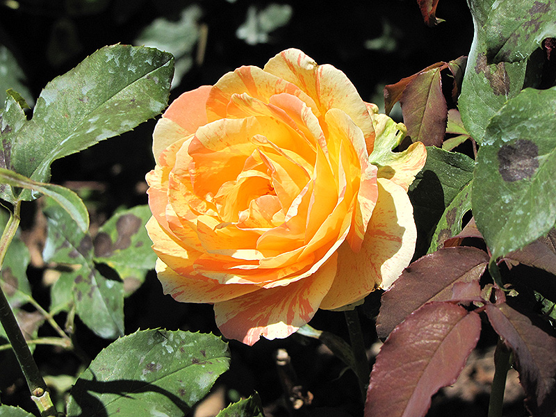 Rainbow Niagara Rose features showy lightly-scented double yellow flowers with orange overtones and pink stripes at the ends of the branches from early summer to mid fall. The flowers are excellent for cutting. It has dark green deciduous foliage. The glossy oval compound leaves do not develop any appreciable fall color.