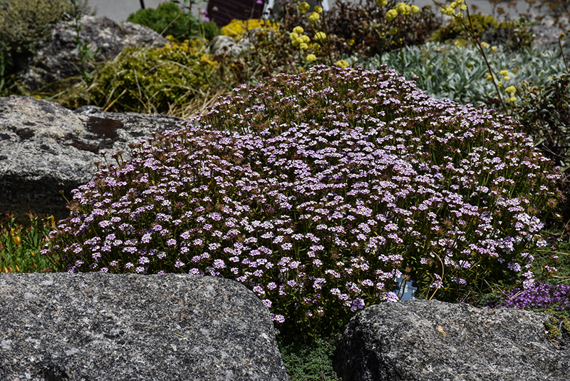 Often treated as a perennial, this is actually a low growing shrub; features a froth of showy pink flowers in spring that mature to a dazzling lilac; tidy evergreen foliage for the rest of the year; good for groundcover, containers, and general garden use