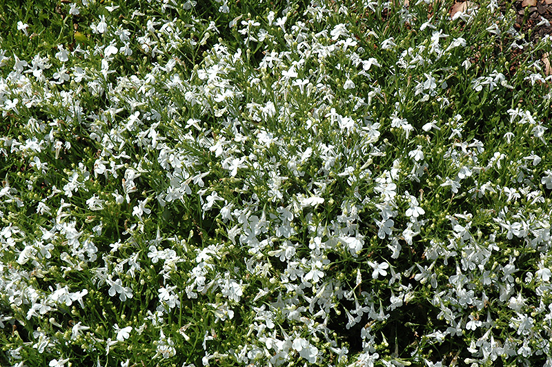 Techno® White Lobelia will grow to be about 8 inches tall at maturity, with a spread of 12 inches. When grown in masses or used as a bedding plant, individual plants should be spaced approximately 10 inches apart. Its foliage tends to remain low and dense right to the ground. Although it's not a true annual, this fast-growing plant can be expected to behave as an annual in our climate if left outdoors over the winter, usually needing replacement the following year. As such, gardeners should take into consideration that it will perform differently than it would in its native habitat.