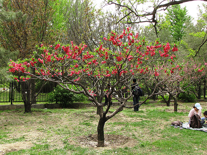 Double Red Flowering Peach will grow to be about 20 feet tall at maturity, with a spread of 20 feet. It has a low canopy with a typical clearance of 3 feet from the ground, and is suitable for planting under power lines. It grows at a fast rate, and under ideal conditions can be expected to live for 40 years or more.