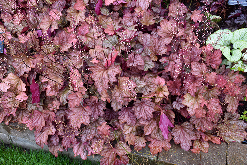 Carnival Watermelon Coral Bells is primarily valued in the garden for its distinctive form, with the flower stalks towering over the foliage. It attractive crinkled lobed leaves emerge peach in spring, turning grayish green in color with showy coppery-bronze variegation and tinges of pink the rest of the year.