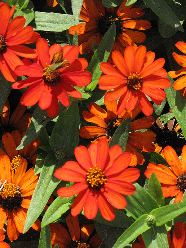 Profusion Orange Zinnia features bold orange daisy flowers with yellow eyes at the ends of the stems from mid spring to late summer. The flowers are excellent for cutting. Its pointy leaves remain green in color throughout the season.