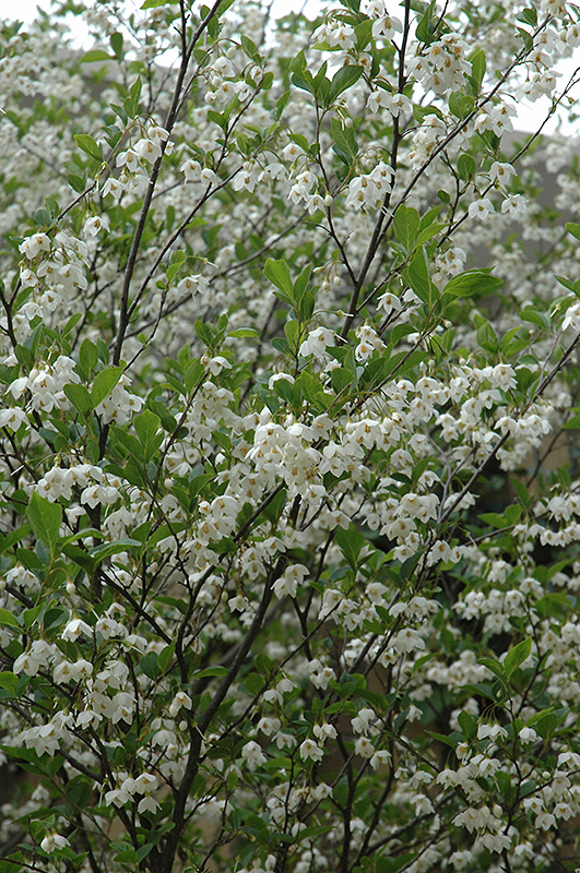 A very uniform and symmetrical small tree, featuring the most delicate white bell-shaped flowers which hang loosely from the upswept, spreading branches in early spring; needs moist, organic soil and some shelter, does well in part shade