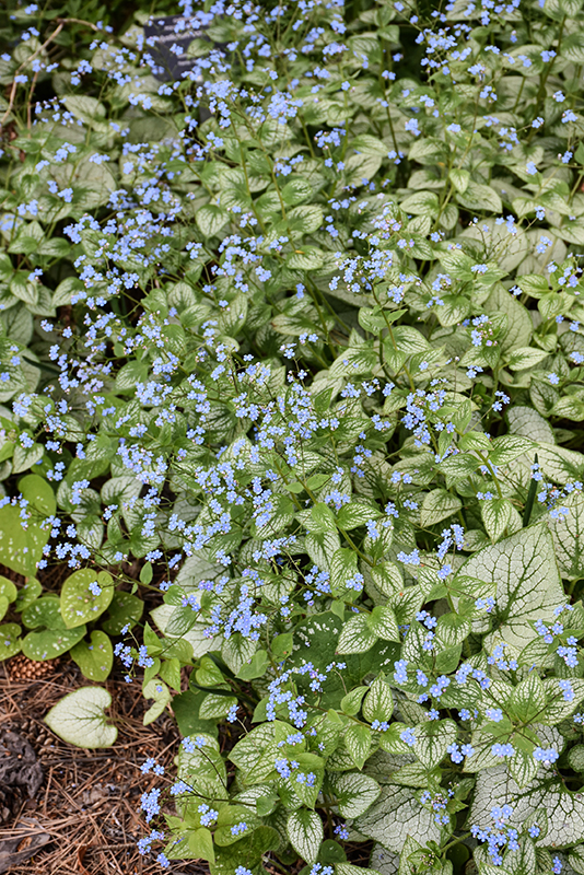 Attractive, large heart shaped leaves are green veined, with silver overlay; clusters of tiny blue flowers in spring; best in moist, rich, well drained soil