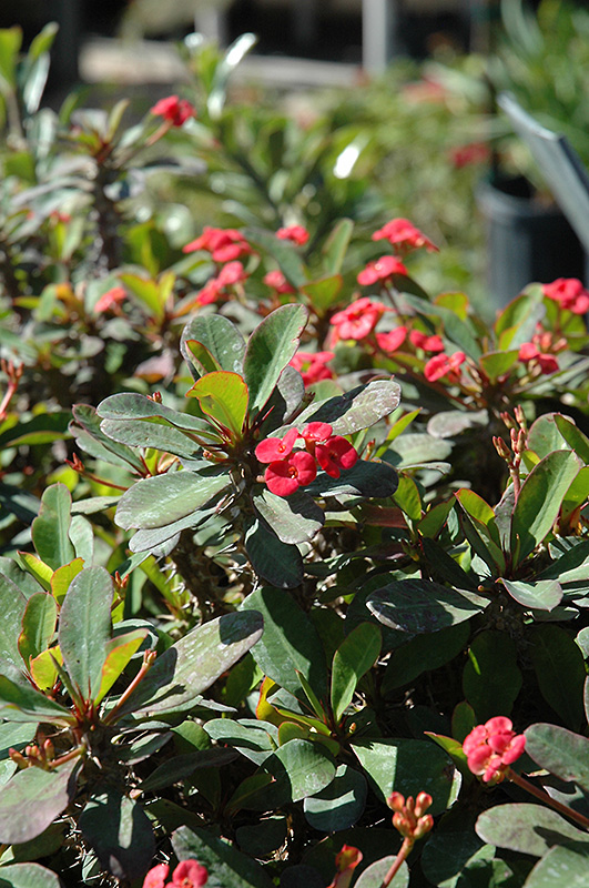 Crown Of Thorns features showy clusters of green flowers with red bracts held atop the branches from early spring to late fall. Its attractive oval leaves emerge light green, turning green in color throughout the year.
