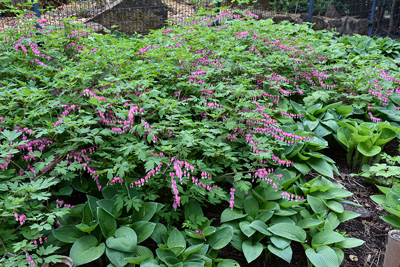 Bushy upright mounded selection features blue-green fern-like foliage and arching stems of heart shaped locket flowers with white protruding petals; excellent for shaded borders and beds; beautiful cut flower; goes into summer dormancy