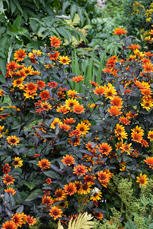 Bleeding Hearts False Sunflower has masses of beautiful red daisy flowers with orange overtones, brick red eyes and yellow tips at the ends of the stems from early summer to mid fall, which are most effective when planted in groupings. The flowers are excellent for cutting. Its serrated oval leaves emerge green in spring, turning dark green in color with showy deep purple variegation throughout the season. The deep purple stems can be quite attractive.