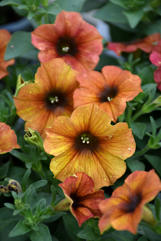 SuperCal® Premium Cinnamon Petchoa is blanketed in stunning crimson trumpet-shaped flowers with black throats at the ends of the stems from mid spring to late summer. Its pointy leaves remain green in color throughout the season.