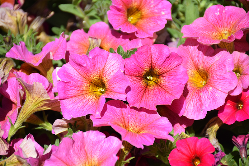 SuperCal® Premium Sunray Pink Petchoa is blanketed in stunning lavender trumpet-shaped flowers with pink overtones, gold throats and orange veins at the ends of the stems from mid spring to late summer. Its pointy leaves remain green in color throughout the season.