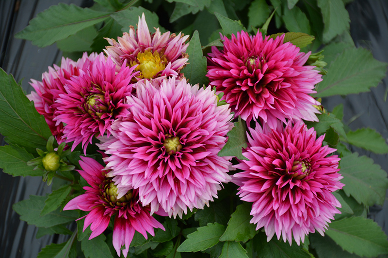 Labella® Maggiore Deep Rose Dahlia features showy double rose daisy flowers with shell pink overtones and yellow eyes at the ends of the stems from mid summer to mid fall. The flowers are excellent for cutting. Its serrated pointy leaves remain green in color throughout the season.