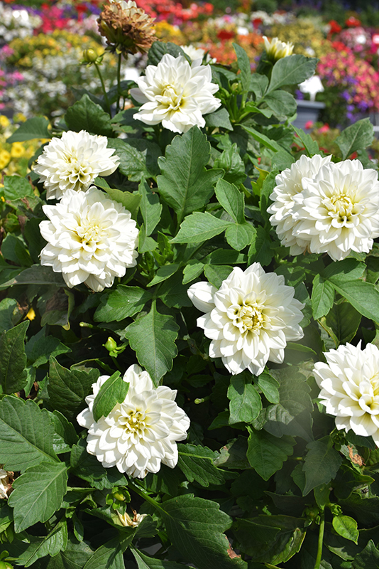Labella® Maggiore White Dahlia features showy double white daisy flowers with buttery yellow eyes at the ends of the stems from mid summer to mid fall. The flowers are excellent for cutting. Its serrated pointy leaves remain green in color throughout the season.