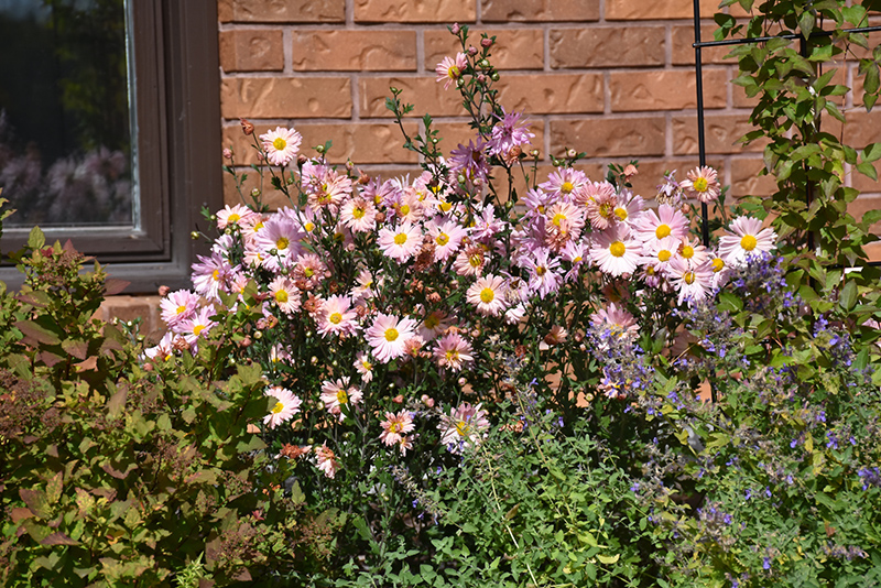 Hillside Sheffield Chrysanthemum is covered in stunning shell pink daisy flowers with white overtones, gold eyes and peach streaks at the ends of the stems from late summer to late fall, which emerge from distinctive coral-pink flower buds. The flowers are excellent for cutting. Its fragrant ferny leaves remain dark green in color throughout the season.