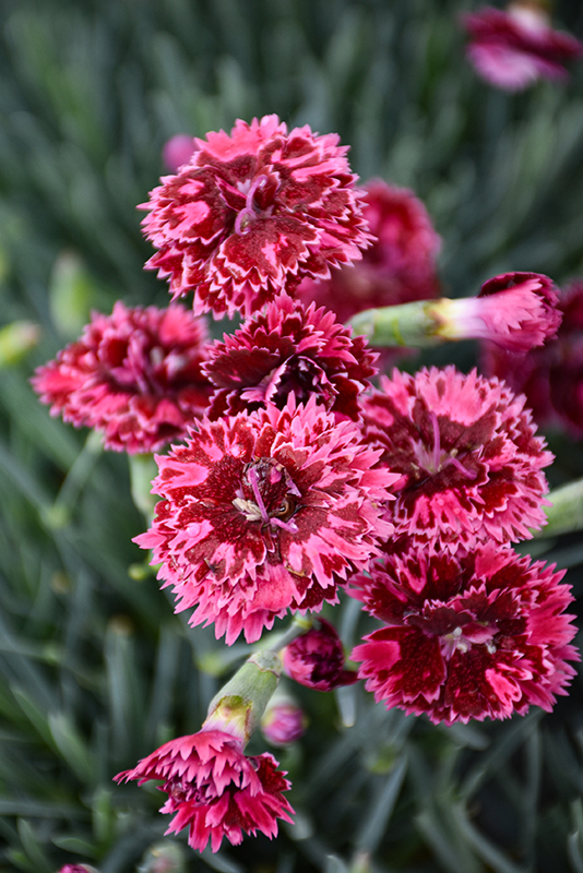 Fruit Punch® Black Cherry Frost Pinks has masses of beautiful fragrant semi-double red frilly flowers with creamy white edges at the ends of the stems from early summer to early fall, which are most effective when planted in groupings. The flowers are excellent for cutting. Its attractive narrow leaves remain grayish green in color with hints of silvery blue throughout the year.