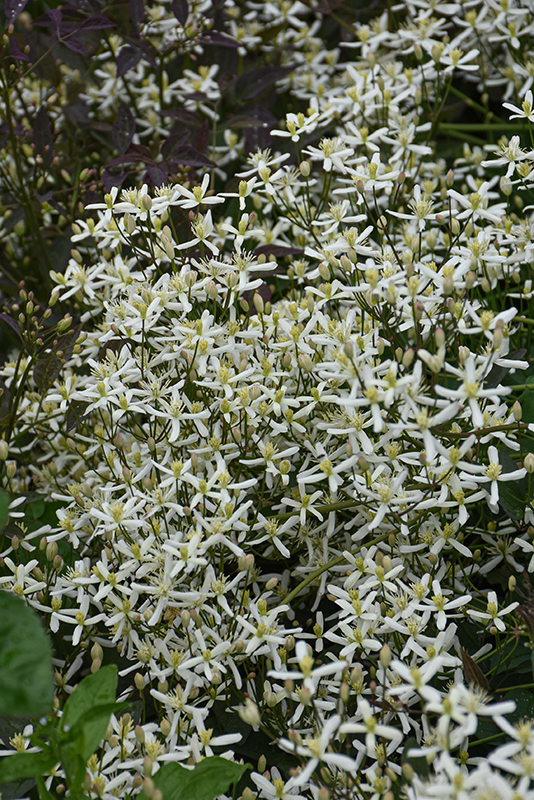 Purple Ground Clematis features airy panicles of lightly-scented white star-shaped flowers at the ends of the stems in early summer. Its attractive compound leaves emerge deep purple in spring, turning dark green in color with hints of deep purple throughout the season.