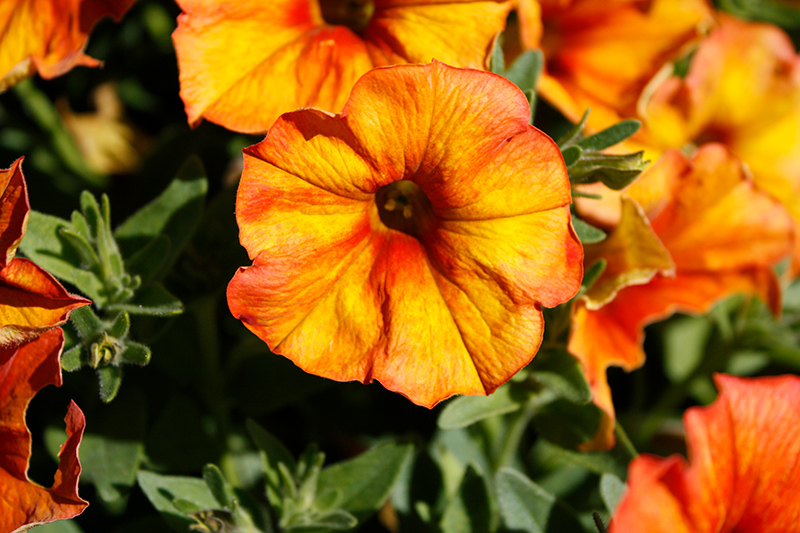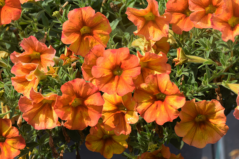 SuperCal® Premium Sunset Orange Petchoa is blanketed in stunning gold trumpet-shaped flowers with orange overtones at the ends of the stems from mid spring to late summer. Its pointy leaves remain green in color throughout the season.