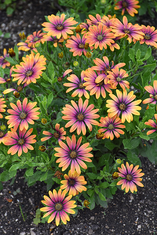 Zion™ Purple Sun African Daisy is clothed in stunning orange daisy flowers with steel blue eyes and a deep purple ring at the ends of the stems from early summer to mid fall. The flowers are excellent for cutting. Its spiny narrow leaves remain green in color throughout the season.