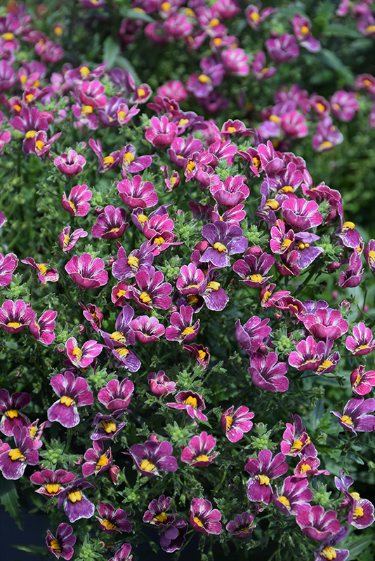 Nesia™ Tutti Frutti Nemesia features dainty spikes of lightly-scented fuchsia pea-like flowers with white overtones, yellow eyes and a plum purple flare at the ends of the stems from mid spring to late summer. Its small serrated pointy leaves remain green in color throughout the season.