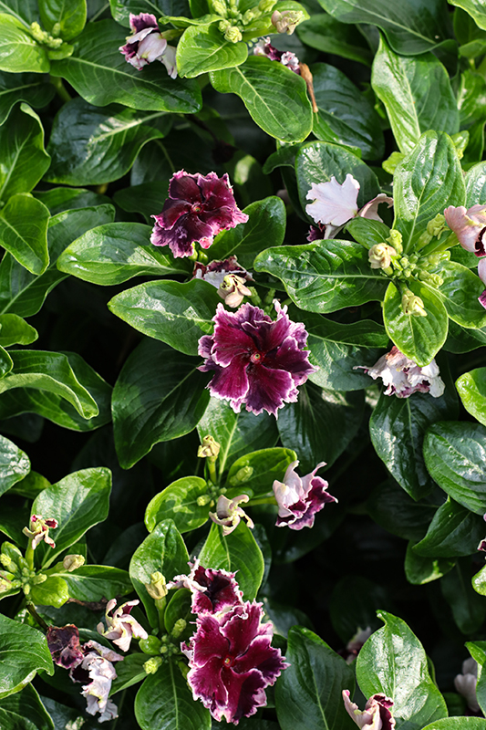 Soiree® Flamenco Plum Velvet Vinca features showy semi-double plum purple star-shaped flowers with pink edges at the ends of the stems from late spring to mid fall. Its glossy oval leaves remain dark green in color throughout the year.