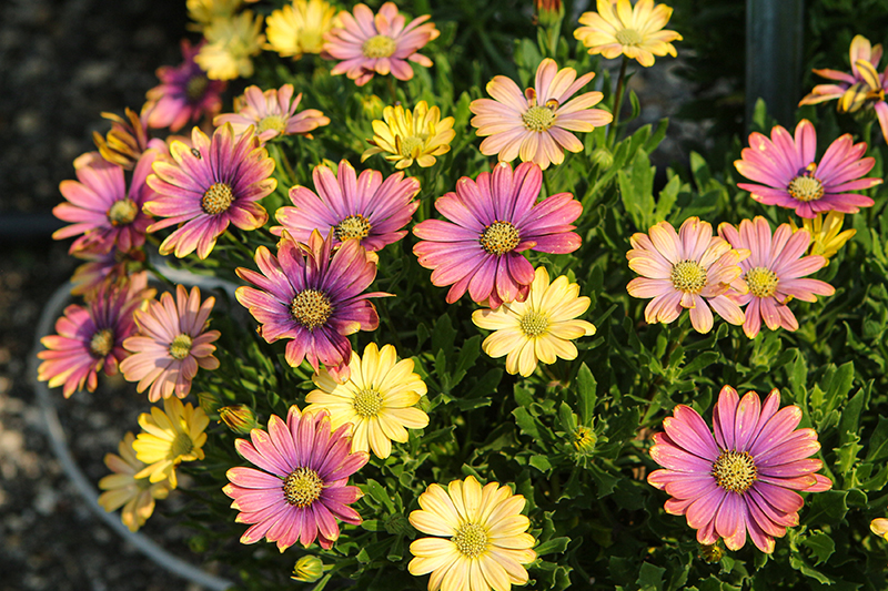 An excellent branching and fully mounded variety, wonderful for patio containers, borders and fresh cut arrangements; Amazing large blooms transition from yellow to pink to blue; deadhead to encourage new growth