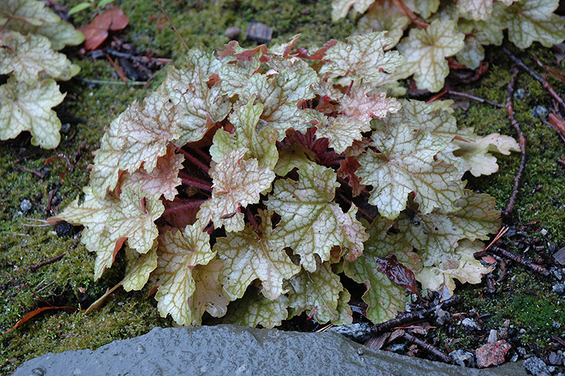 Ginger Ale Coral Bells will grow to be only 6 inches tall at maturity extending to 12 inches tall with the flowers, with a spread of 15 inches. When grown in masses or used as a bedding plant, individual plants should be spaced approximately 12 inches apart. Its foliage tends to remain low and dense right to the ground. It grows at a medium rate, and under ideal conditions can be expected to live for approximately 10 years. As an evegreen perennial, this plant will typically keep its form and foliage year-round.