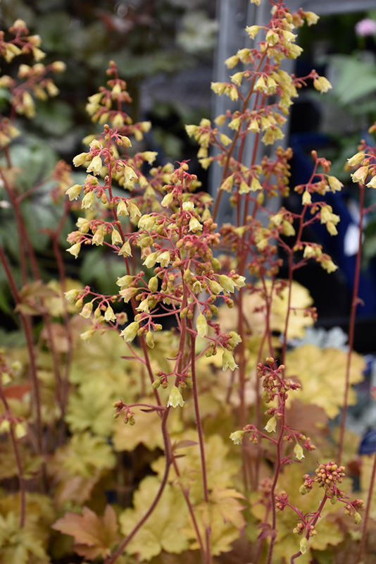 Ginger Ale Coral Bells features dainty spikes of buttery yellow bell-shaped flowers rising above the foliage from late spring to early summer. Its attractive crinkled lobed leaves remain tan in color with distinctive khaki (brownish-green) veins and tinges of silver throughout the year.