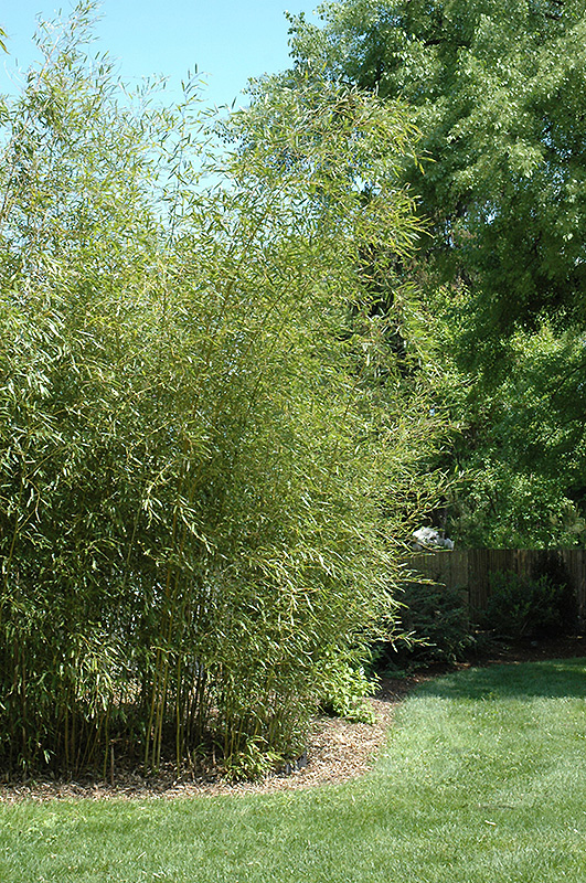 Yellow Grove Bamboo will grow to be about 8 feet tall at maturity, with a spread of 24 inches. It tends to be leggy, with a typical clearance of 2 feet from the ground, and should be underplanted with lower-growing perennials. It grows at a fast rate, and under ideal conditions can be expected to live for approximately 20 years. As an herbaceous perennial, this plant will usually die back to the crown each winter, and will regrow from the base each spring. Be careful not to disturb the crown in late winter when it may not be readily seen!