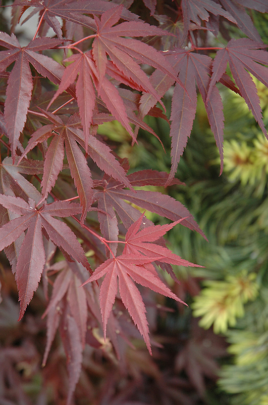 This natural dwarf has delicate deeply lobed leaves emerging red which may fade a little over summer to burgundy green; upright growth habit, almost columnar; a sport of Bloodgood maple, ideal for general garden use