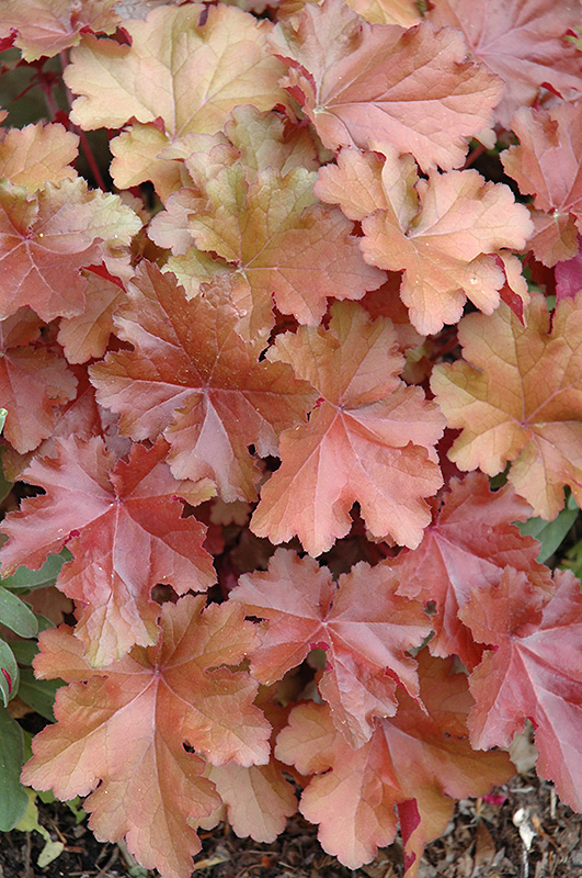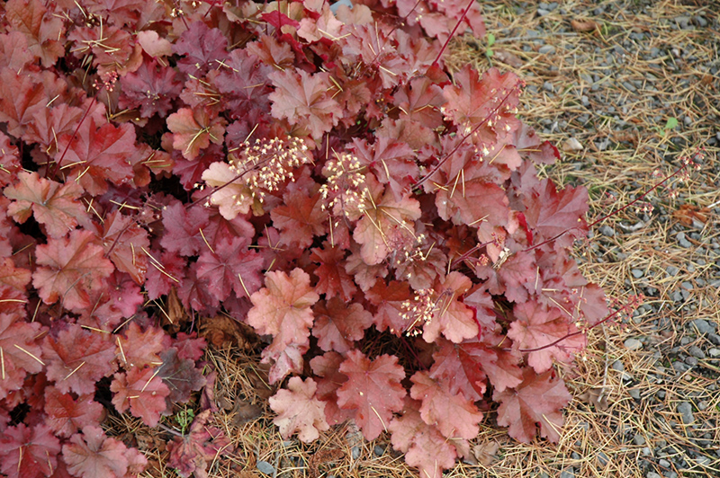 Mahogany Coral Bells will grow to be about 8 inches tall at maturity extending to 15 inches tall with the flowers, with a spread of 15 inches. When grown in masses or used as a bedding plant, individual plants should be spaced approximately 12 inches apart. Its foliage tends to remain low and dense right to the ground. It grows at a medium rate, and under ideal conditions can be expected to live for approximately 10 years. As an evegreen perennial, this plant will typically keep its form and foliage year-round.
