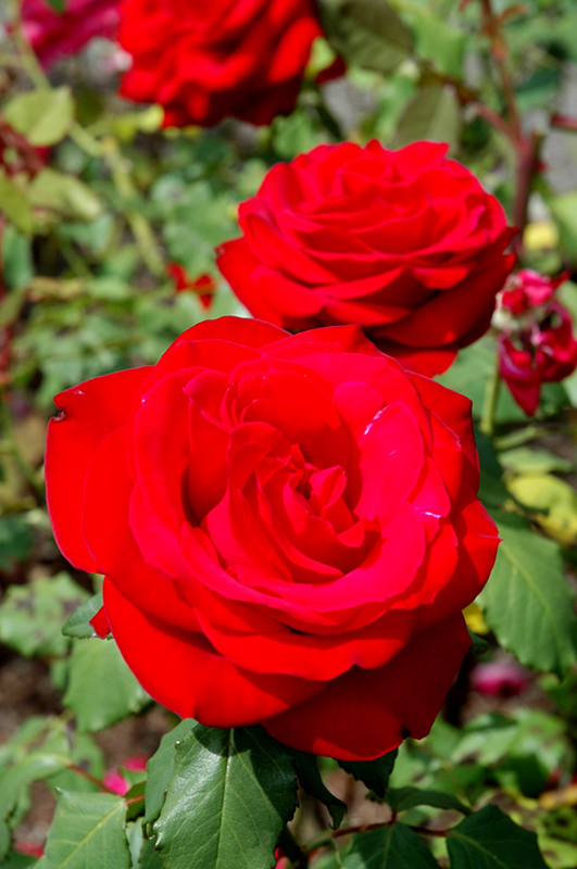 An exceptional hybrid tea rose that presents its brilliant, reddest of red long stem beauties all season long; a dramatic addition to the garden that is very disease resistant; the blooms are long lived as cut flowers as well